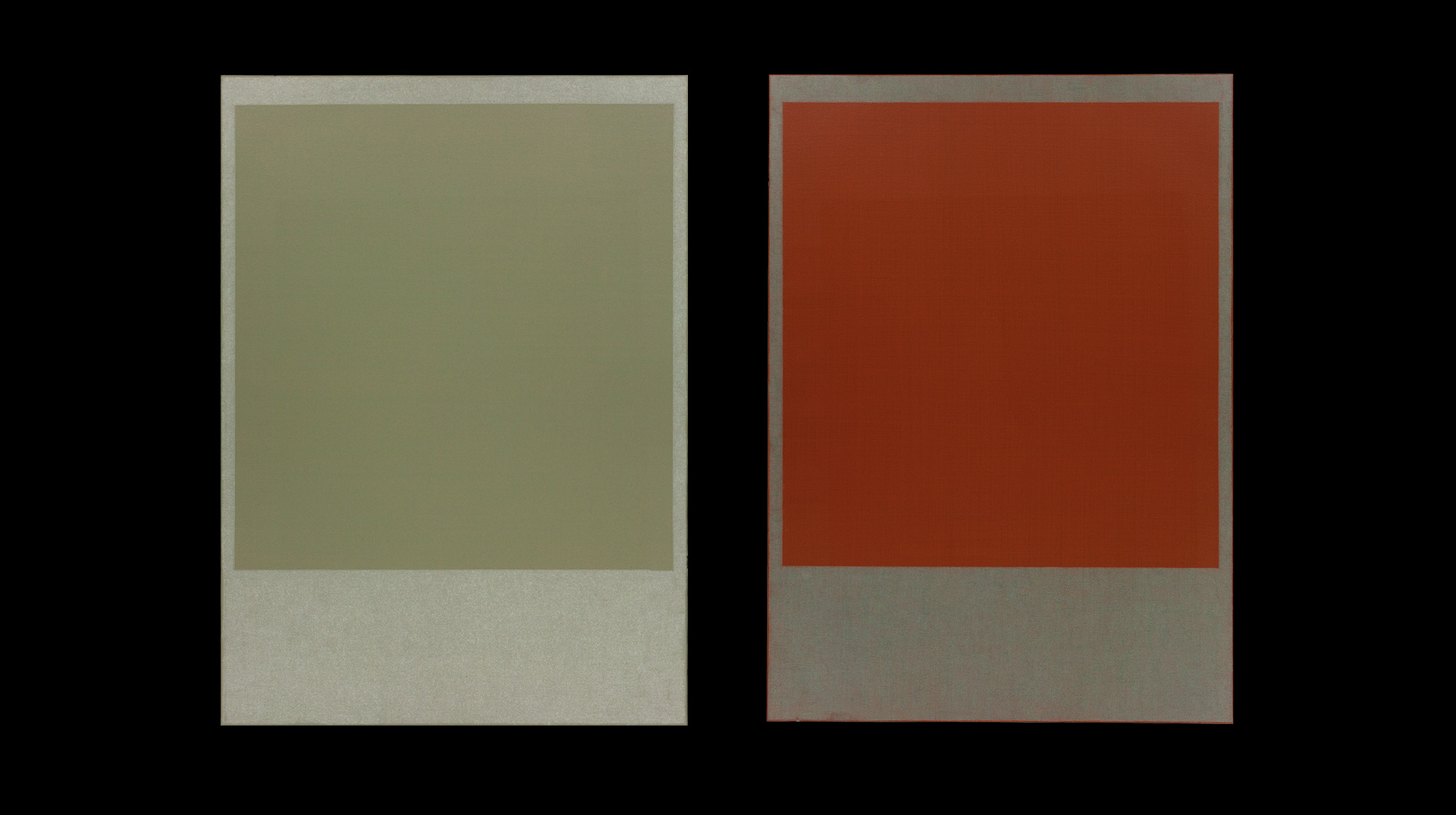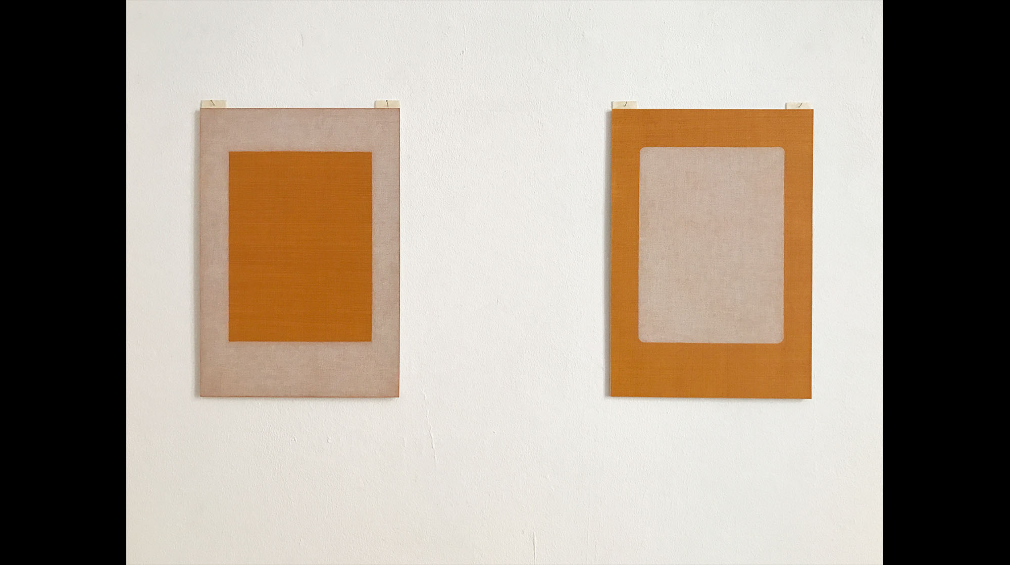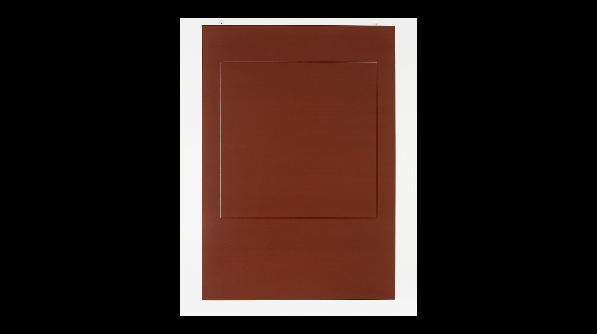 In „Tableau“, dem vorläufig letzten Bild dieser Serie, geht die Künstlerin noch einen Schritt weiter. Die Leinwand besteht aus sieben übereinander geklebten Nesselschichten und sieht aus wie ein Diptychon, ist aber ein Bild. Ein intensives Lascauxbraun bedeckt zwei identische Rechtecke, die nebeneinander stehen, nur durch einen schmalen Streifen gebleichten Nessels voneinander getrennt. Schaut man genau hin, bemerkt man leichte Marmorierungen. Die Farbe scheint auf dem Weg, auch diese Grenze zu überwinden. Die alten Dualismen und Polaritäten, die Vertauschung von Innen und Außen, der Gegensatz von Fläche und Raum und die Gewichte der Farbe, all das scheint hier zu vorläufiger Ruhe und zum Ausgleich gekommen zu sein.